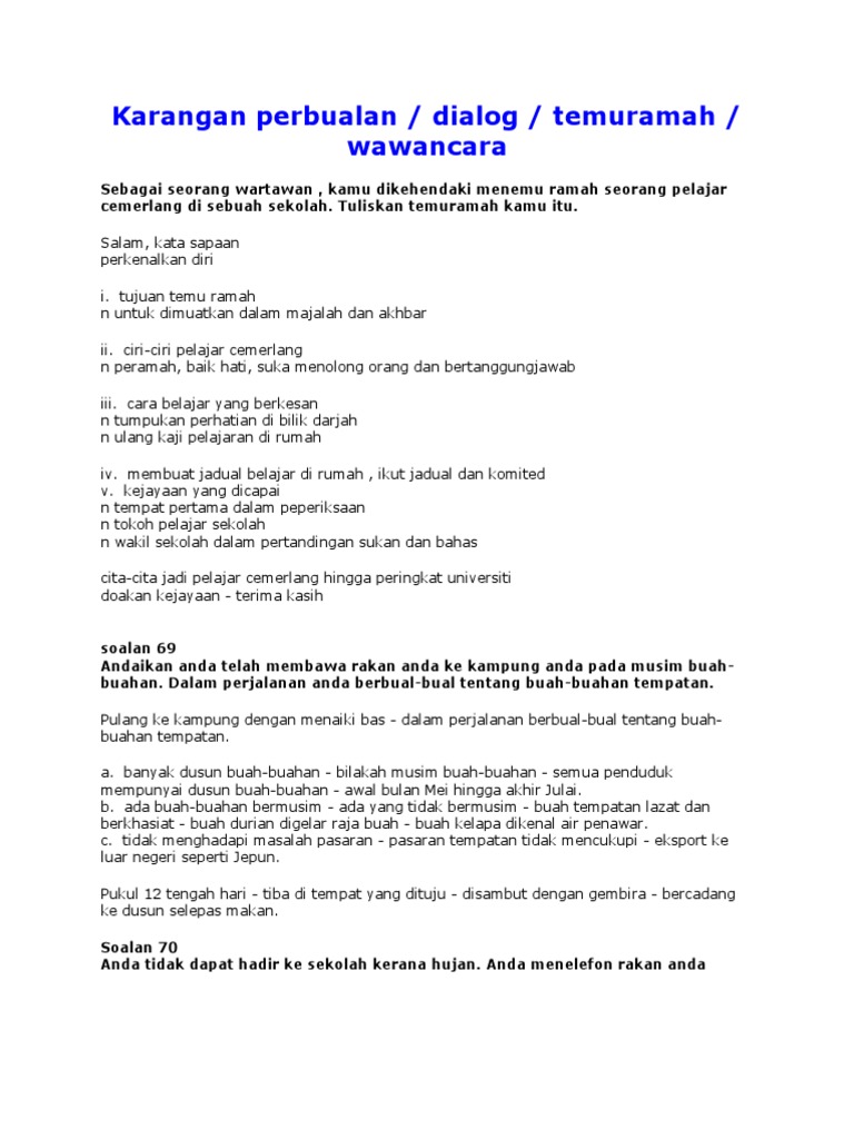 Contoh Karangan Dialog Temu Bual from online.anyflip.com Mulai dari mengenal artinya sampai memahami jenisnya. Sebelum mula menulis karangan, sediakanlah rangka karangan terelebih dahulu. Rangka karangan penting kerana dapat dijadikan panduan ketika menulis karangan. Novel tingkatan 4, 5 (spm). Amalkan menulis salam sebelum memulakan karangan jenis ucapan, syarahan, surat tidak rasmi atau jenis karangan yang sesuai.ini adalah kerana, diyakini kebanyakan yang memeriksa kertas penulisan adalah orang. Jika hanya satu jenis ayat saja yang digunakan akan timbul rasa jemu pada pembaca. Mahathir pernah menyatakan bahawa kita tidak akan mencapai kemajuan yang cepat jika kita tidak menumpukan perhatian dalam penguasaan bahasa inggeris. Panduan menulis karangan jenis syarahan.